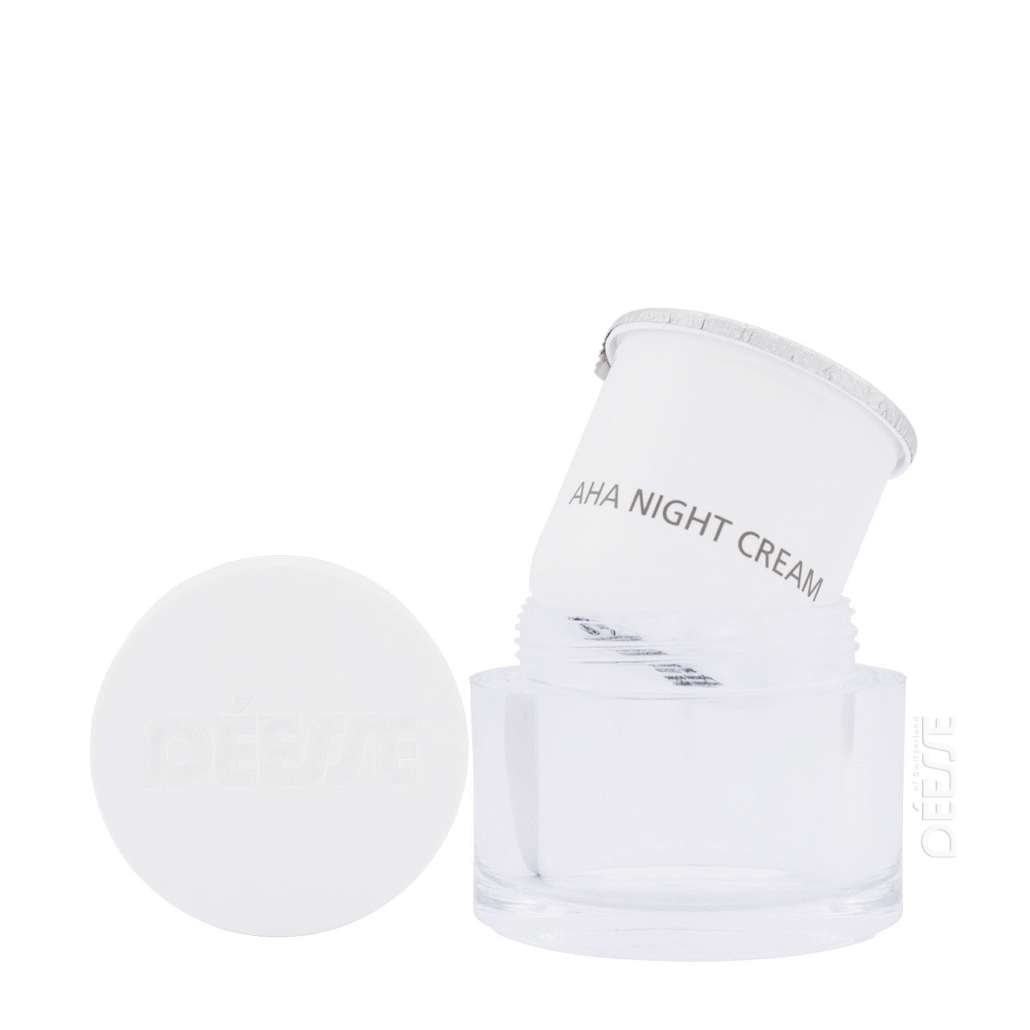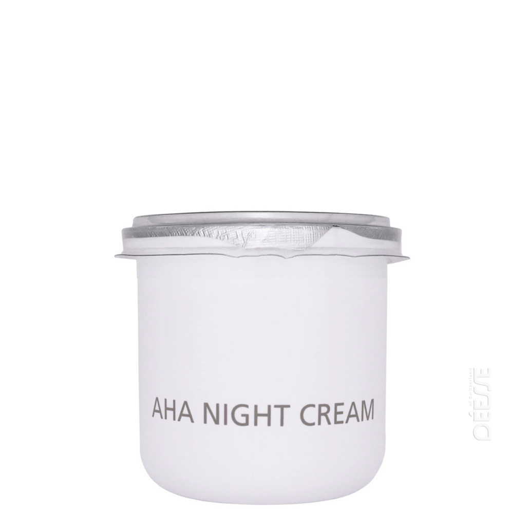 Die AHA Nachtcreme enthält Alpha-Hydroxysäuren, die natürlicherweise in Milch, Zuckerrohr, Äpfeln und anderen Früchten vorkommen. Sie wirken sanft auf die Hornschicht der Haut, lösen abgestorbene Zellen und fördern so die Hauterneuerung. Dadurch erscheint die Haut glatter, gleichmäßiger und strahlender. Mandelöl pflegt und schützt, während Tocopherol (Vitamin E) die Haut intensiv mit Feuchtigkeit versorgt und vor äußeren Einflüssen schützt. Die regelmäßige Anwendung unterstützt einen gleichmäßigen Teint und eine frische Ausstrahlung.